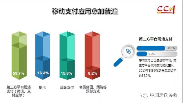 随着移动支付用户数量的猛增,移动支付已渗透到人民生活的各个场景,特别是用餐场景引入支付宝、微信等支付方式,其手续费较低、交易方便和安全性的特征,为餐厅和消费者均提供了便利。调查显示,已有59.7%的消费者在用餐结账时使用移动支付。根据美团点评大数据显示,2017年1—11月,餐饮消费移动支付渗透率上升了3倍。2017年底,支付宝、微信都表示要为餐饮企业开发模块,并提供大数据分析。两大支付平台纷纷加紧涉足餐饮市场,预计将对固有“餐饮互联网+产品”造成冲击。