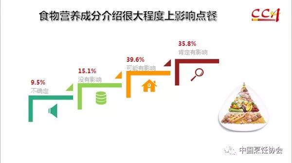 根据调查,在菜单中除了菜品名字、图片等基础信息外,消费者还希望看到食物营养成分介绍、食材重量和烹饪者介绍等信息。超过三成消费者非常肯定地表示,如果点餐时有食物营养成分介绍,将会影响自己的点餐,比重较去年有所上升,另有近四成消费者则表示“可能会有影响”。