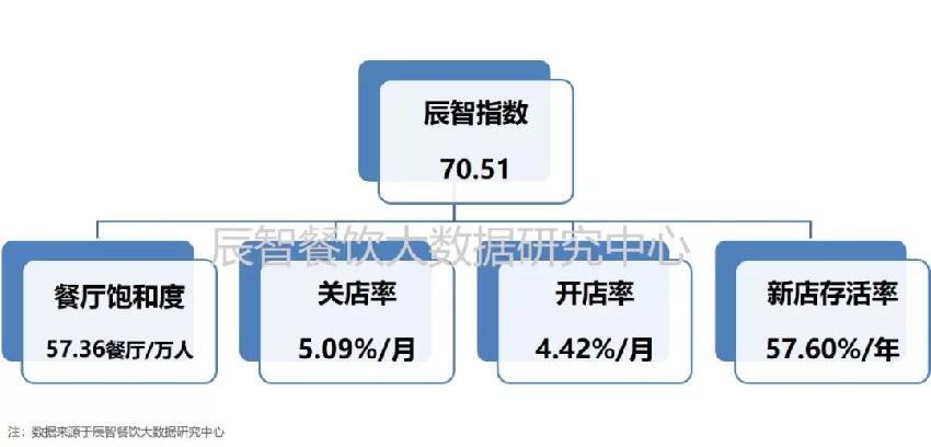 2017年中国餐饮整体辰智指数为70.51 ,餐厅饱和度57.36餐厅/万人 ,关店率5.09%/月, 开店率 4.42%/月, 新店存活率只有57.60%/年。