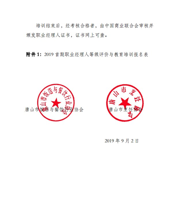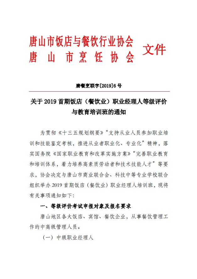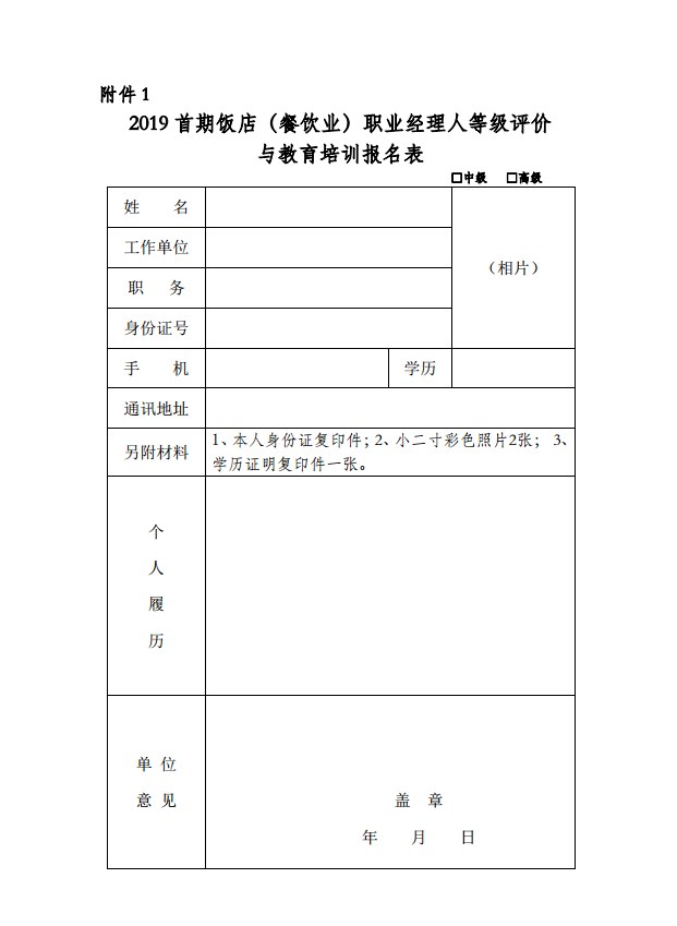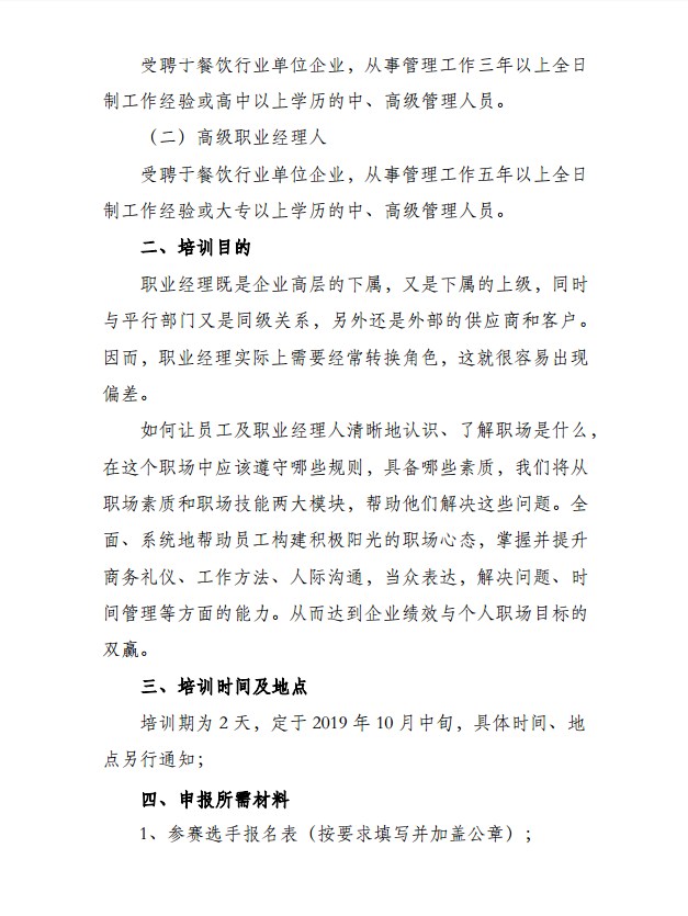 关于2019首期饭店(餐饮业)职业经理人等级评价与教育培训班的通知