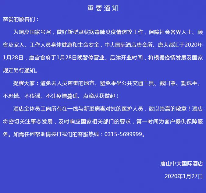 重要通知:唐山中大国际酒店暂停营业
