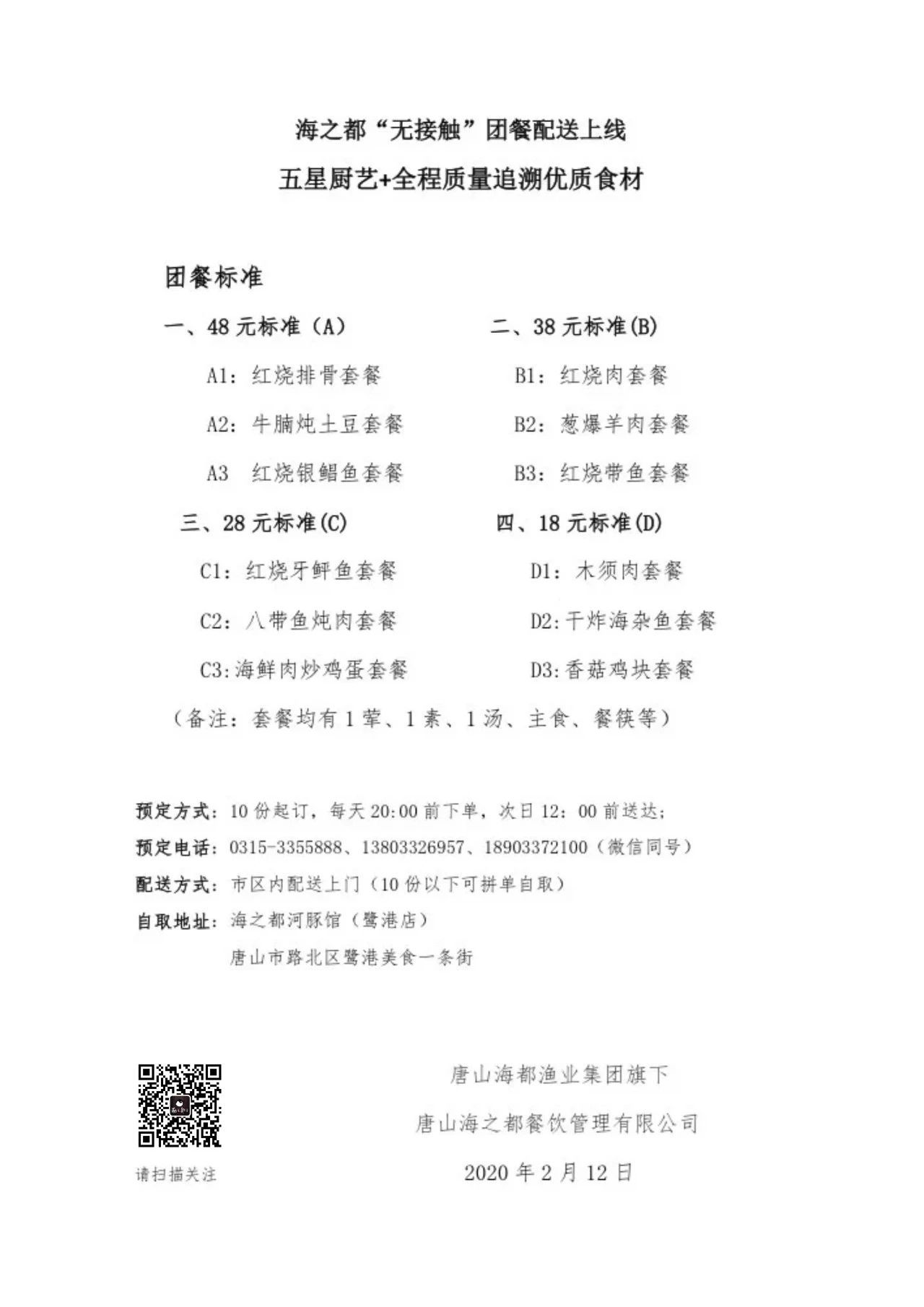 唐山海之都餐饮管理有限公司承诺将严格按照《餐饮服务食品安全操作规范》《餐饮业服务质量评估规范》《餐饮业在新型冠状病毒流行期间防控服务指南》以及省、市政府及有关行业部门的相关要求,认真落实各项防控措施,确保用餐食品的质量和安全,为各企、事业单位提供优质的暖心“平价盒饭”。