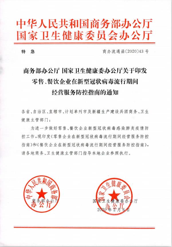 商务部办公厅国家卫生健康委办公厅关于印发零售,餐饮企业在新型冠状病毒流行期间经营服务防控指南的通知
