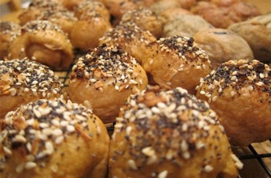 Bantam百吉饼球  它是一种夹心的百吉饼球。在美国纽约西区的商店里,您会发现不仅有熏鲑鱼、西红柿和红洋葱奶油芝士填充的百吉饼球,还有熏肉芝士和枫糖填充的鸡蛋切达干酪百吉饼球。还有一种牛奶饼干Bantam,是将香甜的巧克力曲奇奶油芝士填入红糖胡桃百吉饼球中而成。"