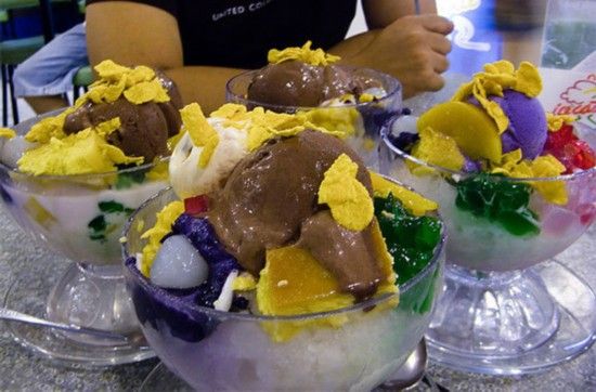 哈啰哈啰(Halo-Halo)  哈啰哈啰是一种特色冰激凌。在它的发源地菲律宾,这不仅仅是一时的流行,而是一种经典的夏季美食。这种冰激凌看起来像一种颜色鲜艳的冰激凌圣代,里面含有甜酱豆、椰肉、甘薯、布丁、榴莲、芭蕉、冰、牛奶和冰激凌。在菲律宾的餐厅和一些冰激凌店或者奶茶店,都有哈啰哈啰出售。"